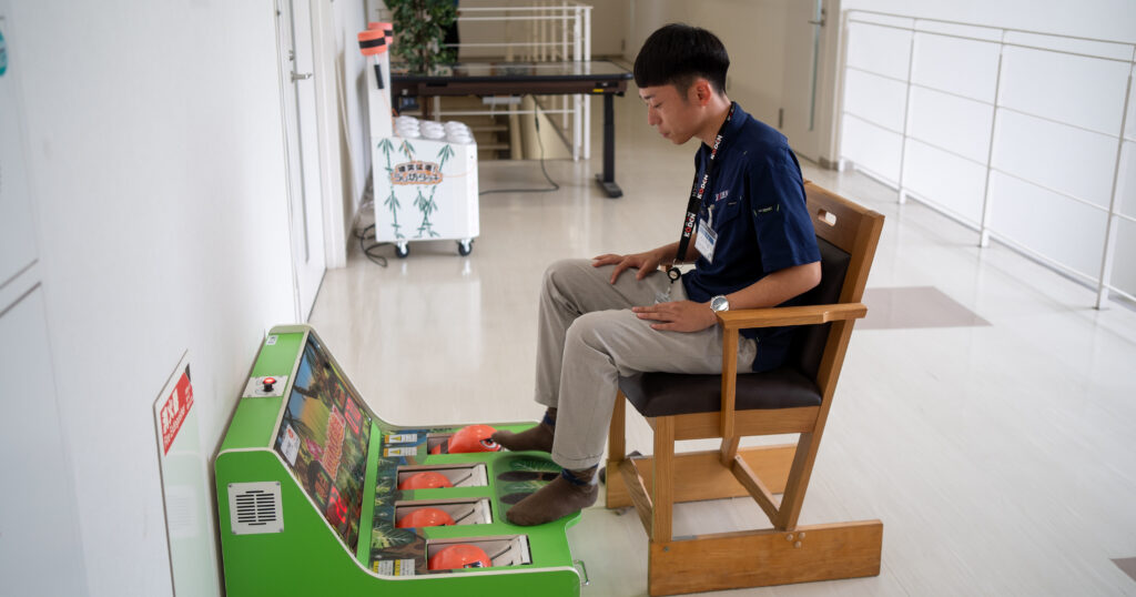当社は、創業以来「ゲーム機を作るノウハウ」を培ってきました。これは言い換えるならば「楽しさを提供するノウハウ」です。そこで、九州大学病院リハビリテーション部さんとの共同で、ゲーム感覚で取り組めるリハビリサポートマシンを開発。「リハビリ=つらい」という従来のイメージを覆すマシンを目指しました。