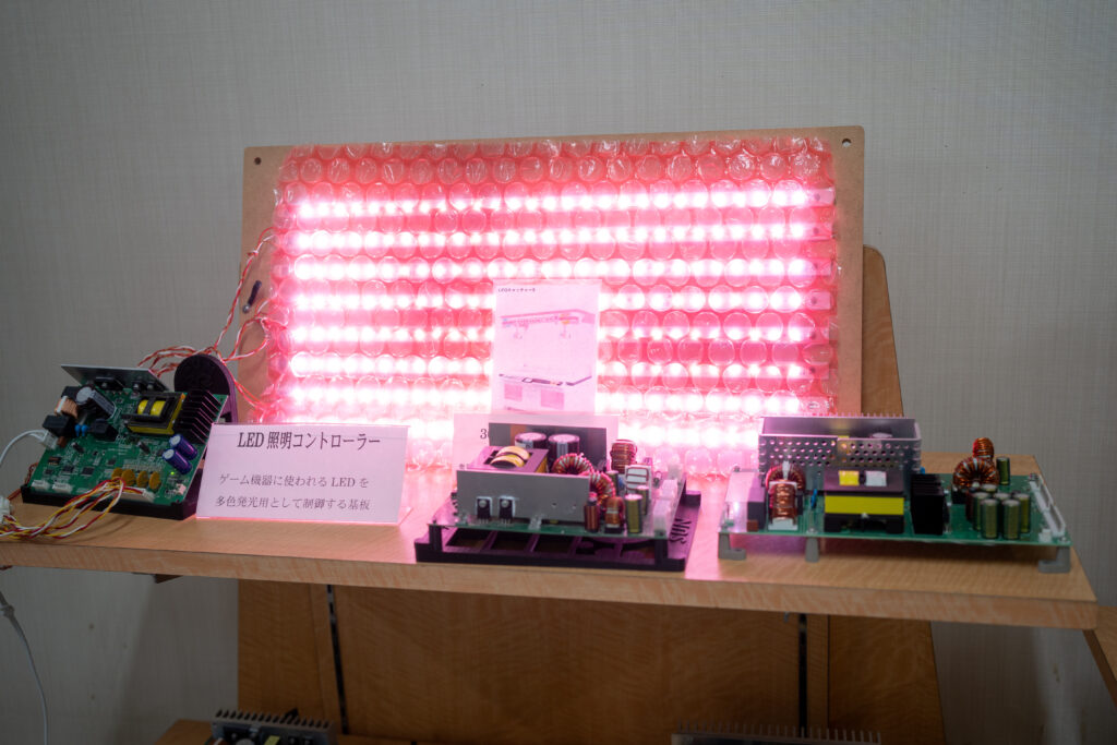 当初は大手ゲームメーカー様が製造・販売するアミューズメント機器の「スイッチング電源(AC電源をDC電源に変換する機器)」の製造からスタートしました。その後、ゲーム機本体の組み立ても担うようになり、現在は電源・アンプ・制御基板から大型筐体完成品までワンストップで提供しています。