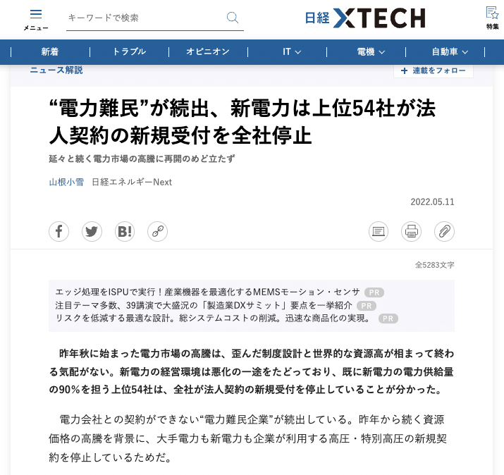 当時は輸入燃料費の高騰により新電力の倒産が相次ぎ、大手の電力会社ですら新規契約の受け入れを停止をしていたタイミングでした。