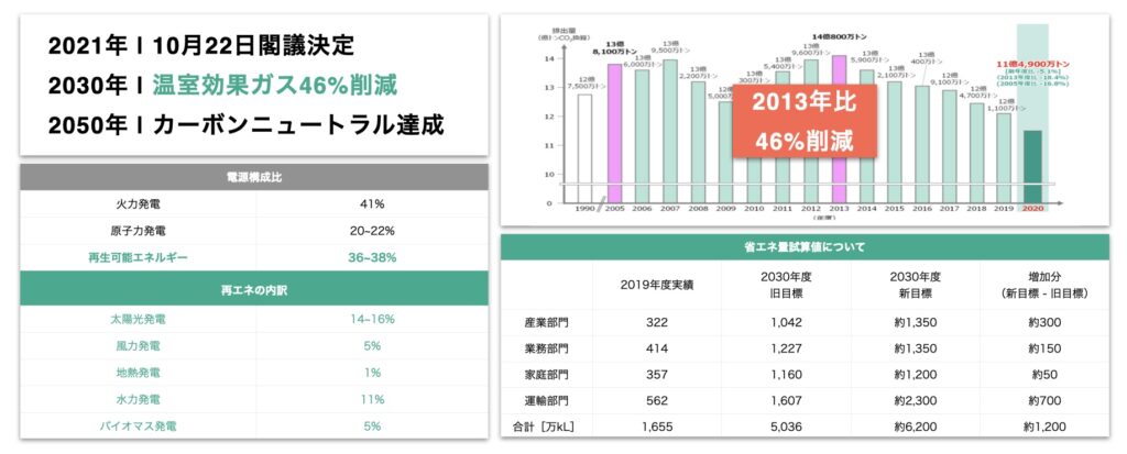 現状確認のためにも、第6次エネルギー基本計画が参考になります。ここでは火力発電を41%、再生可能エネルギーを36〜38%、原子力の再稼働を20〜22%とし、2013年度比で温室効果ガスを46%削減するという目標が設定されています。