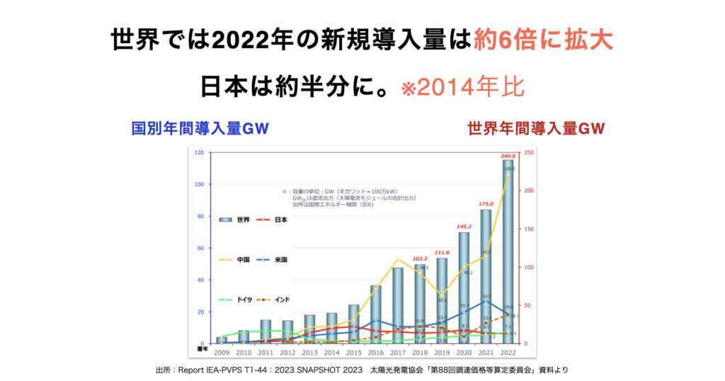 世界と比較しても、日本は導入量が減少傾向にあり、発電量も明らかに少ない状況です。
