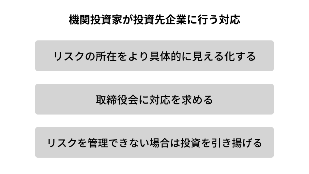 個別企業への対応としては、投資家が投資先企業の気候リスクを精査し、それを直接的に財務諸表に反映させることを要求するなど、具体的な対応を取る動きも多くなってきています。
