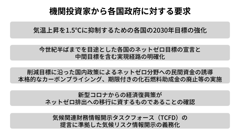 機関投資家のマクロ経済への対応としては、各国政府に1.5℃目標の達成に向けて秩序ある政策の導入を求めるというものになります。