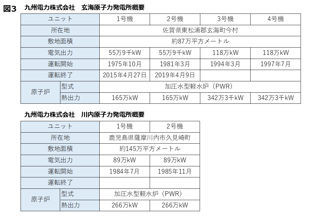 九州電力は、佐賀県にある玄海原子力発電所(1号機~4号機)と鹿児島県にある川内原子力発電所(1号機、2号機)の6基があります。うち玄海原子力発電所の1号機は2015年に、2号機は2019年に運転を終了しましたので現在運転しているのは4基となります。川内原子力発電所の1号機、2号機も図3の通り2024年1基、2025年1基と合計2基が運転終了の目安となる運転開始から40年を迎えます。