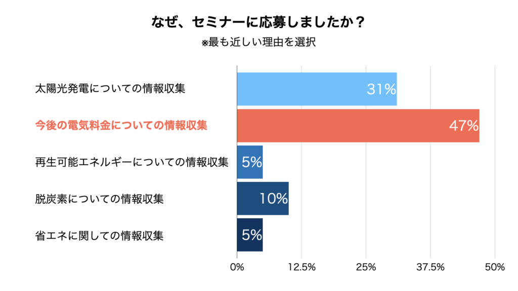 できる限りご要望にお答えしつつ、弊社では今後も脱炭素、電気料金、太陽光発電、再生可能エネルギーといった”次世代で重要なエネルギーに関するテーマ”についてセミナーを実施してまいります。