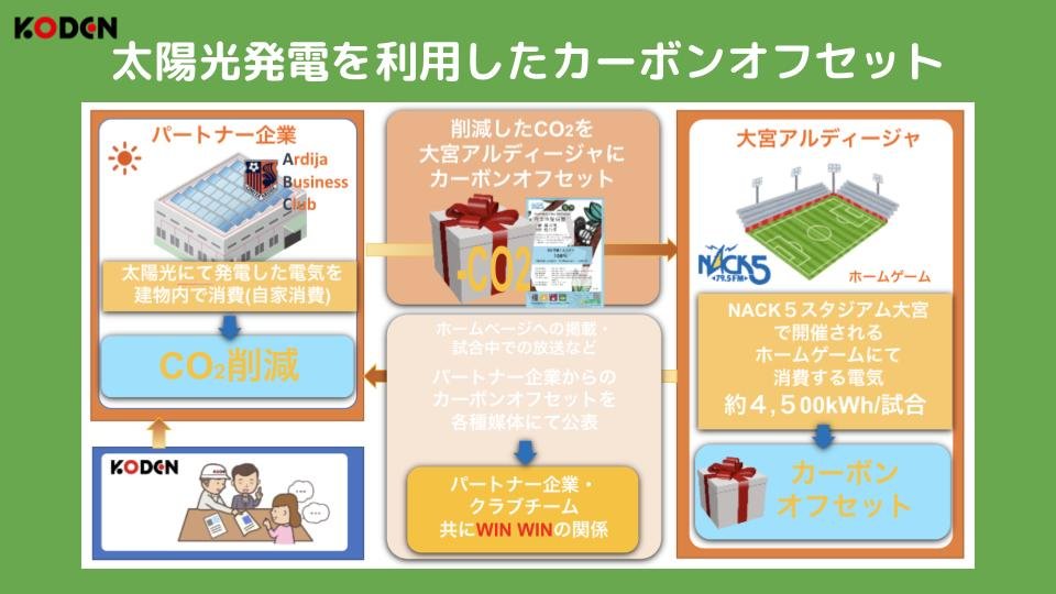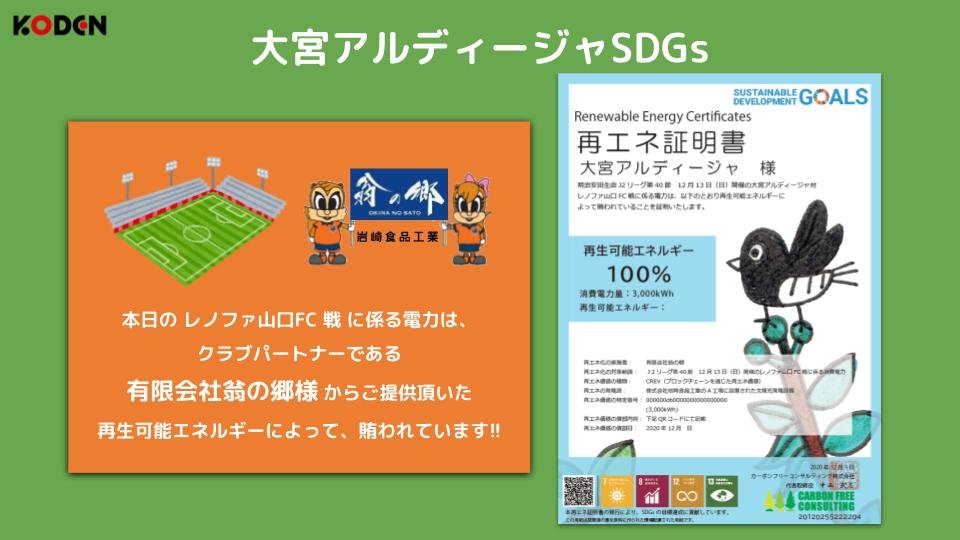 当日のNACK5スタジアム大宮で消費された電力は、大宮アルディージャのクラブパートナーである有限会社翁の郷様と恒電社のパートナーシップのもとにカーボンオフセットを実施。CO2排出量を削減した再生可能エネルギー100%の電力にて試合が行われました。