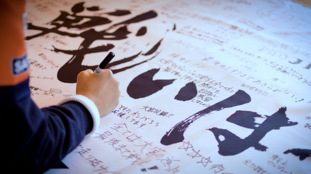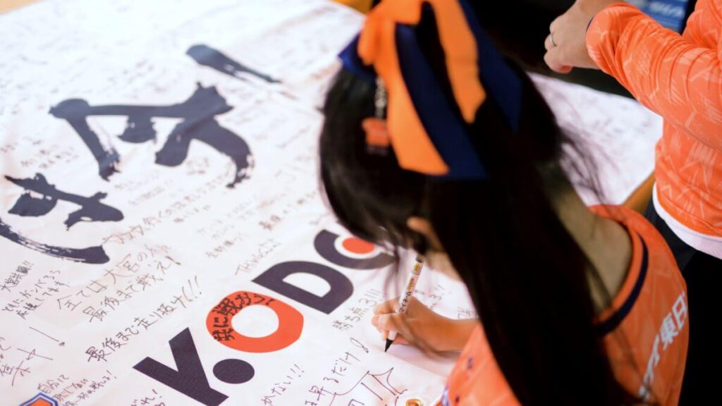 ブースに設置された恒電社「戦いは今!」横断幕に、皆さまの想いを込めた直筆応援メッセージを書いて頂きました。