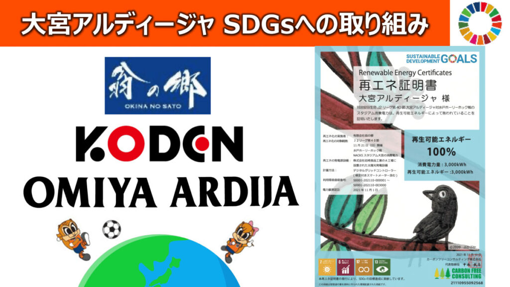当日のNACK5スタジアム大宮で消費された電力は、大宮アルディージャのクラブパートナーである有限会社翁の郷様と恒電社のパートナーシップをもとにカーボンオフセットが実施され、再生可能エネルギー100%の電力にて試合が行われました。