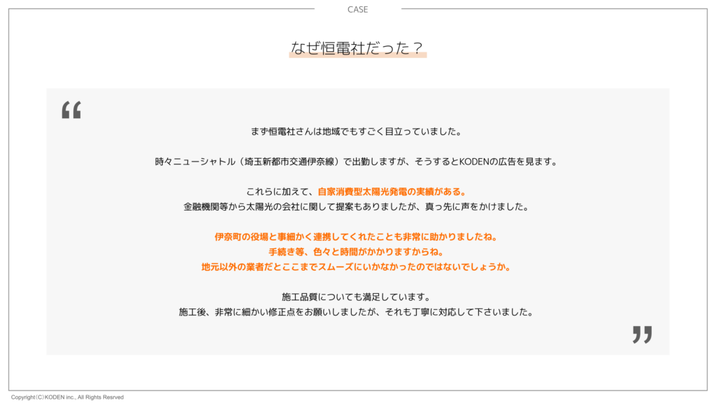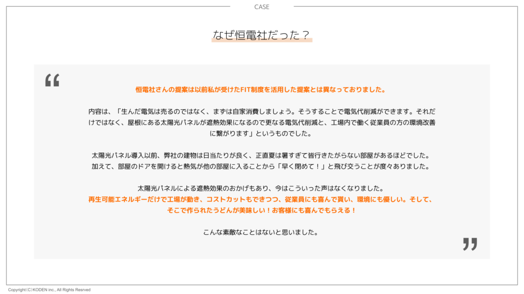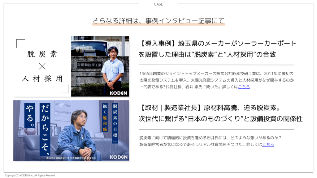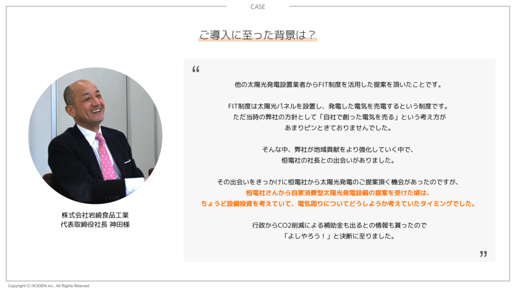 そして、お引き渡し後には経営者様やご担当者様にインタビューを行い、自家消費型太陽光発電設備を導入するに至った背景や、業者を選定する上で考えたことなど、率直なご意見をお聞きし、リアルな想いを発信することにも取り組んできました。