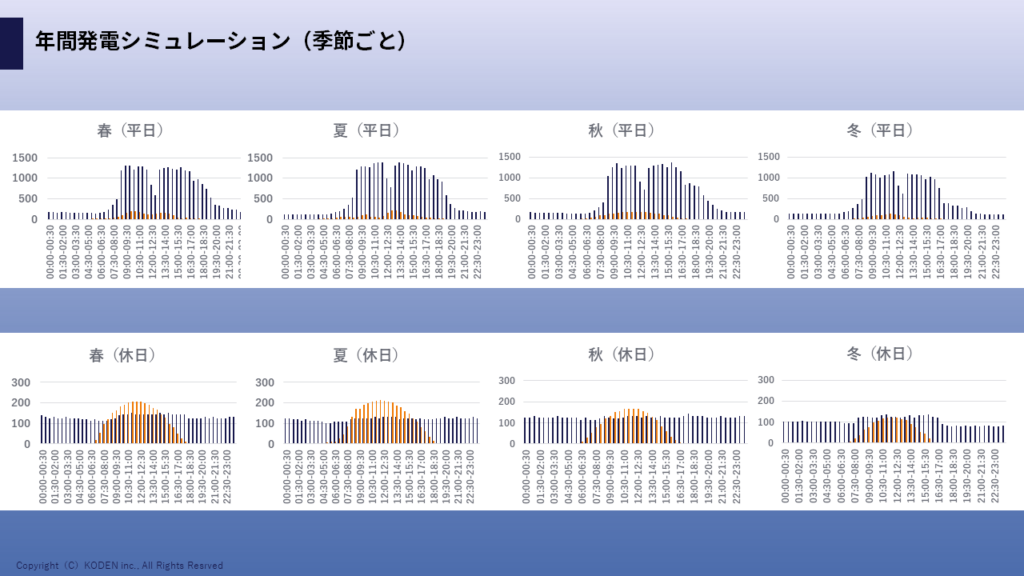 その後、想定しているパネルの枚数で、1年間にどれだけ発電するかをシミュレーションソフトで算出します。このシミュレーションは、365日分、1日あたり48コマ(30分ごと)の細かい時間軸で行われるため、より実態に近い発電量の予測が可能です。